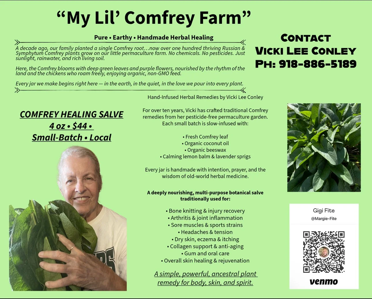 Experience the transformative power of Comfrey oil, meticulously crafted from our organically grown, large comfrey leaves. Over 200 potent plants are infused into coconut oil for 12 hours, enriched further with organic oils like peppermint, eucalyptus, lemon, rosemary, and castor oil. This blend nurtures and heals the body's dermis, serves as an oil pull for oral health and cleansing, and offers benefits for anti-aging, pain relief, deep healing of injuries, hair growth, and profound healing of internal organs through belly button application. It's simply the miracle of all miracle oils.